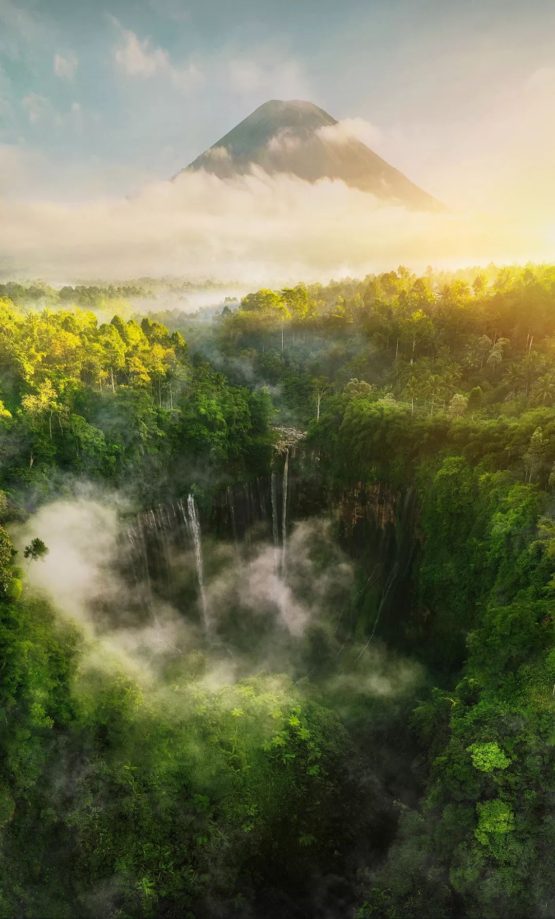 航拍sewu瀑布日出后,出发抵达bromo火山